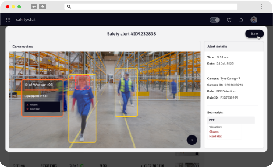 SafetyWhat AI is a market-leading EHS management platform that analyzes the feed from your existing CCTV nodes to accurately predict health and safety hazards in real-time, covering multiple use cases, from PPE Detection, Area Control to Behavioural Safety allowing you to respond with impact and save lives.