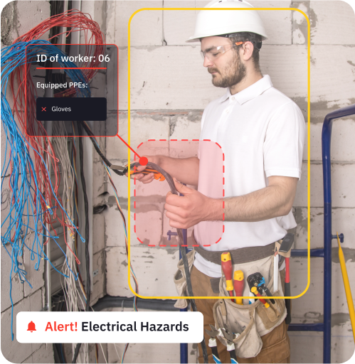 Use machine vision to continuously scan your workspace for electrical hazards like exposed parts, damaged insulations, and wet conditions, and also verify the adherence to proper safety protocols while working electrical equipment and installations.